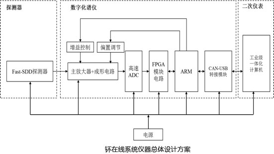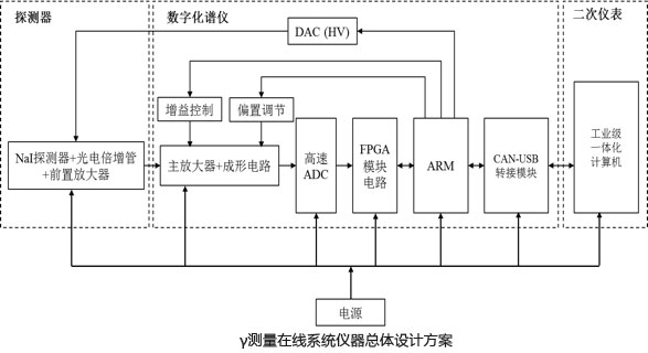 该系统用于实时测定乏燃料后处理厂中在线监测点的铀浓度及Σγ测量。系统包括三个部分,探测器、数字化谱仪、二次仪表。