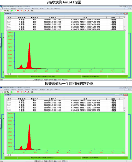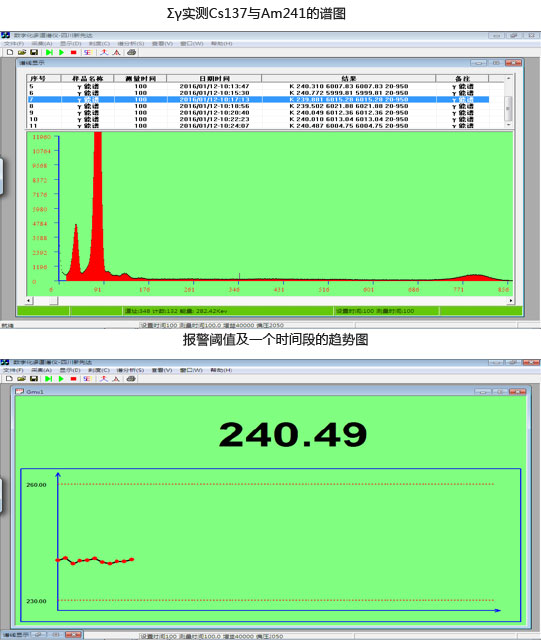 采用无风扇工业级一体化计算机,支持触摸操作,安装Windows 7操作系统。操作软件设计为可视化操作界面,通过USB2.0收发数据。二次仪表一方面用于显示测量时间、总计数、单道计数、能量分辨率、标记区域计数等,并完成在线监测点的铀浓度及Σγ的分析,在显示区域可进行测量浓度、浓度趋势线与谱图之间自由切换显示;另一方面,可远程控制现场的数字化谱仪,设置工作参数。软件操作通过鼠标、触摸屏均可完成。