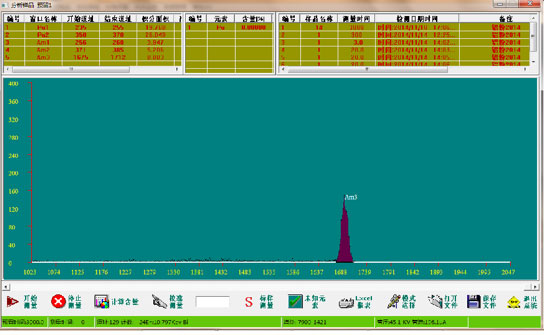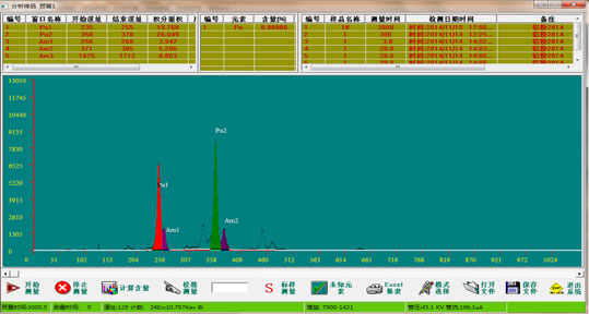采用无风扇工业级一体化计算机,支持触摸操作,安装Windows 7操作系统。操作软件设计为可视化操作界面,通过USB2.0收发数据。二次仪表一方面用于显示测量时间、总计数、单道计数、能量分辨率、标记区域计数等,并根据钚-239的特征X射线能量,完成在线监测点铀浓度的分析,在显示区域可进行测量浓度、浓度趋势线与谱图之间自由切换显示;另一方面,可远程控制现场的数字化谱仪,设置工作参数。软件操作通过鼠标、触摸屏均可完成。